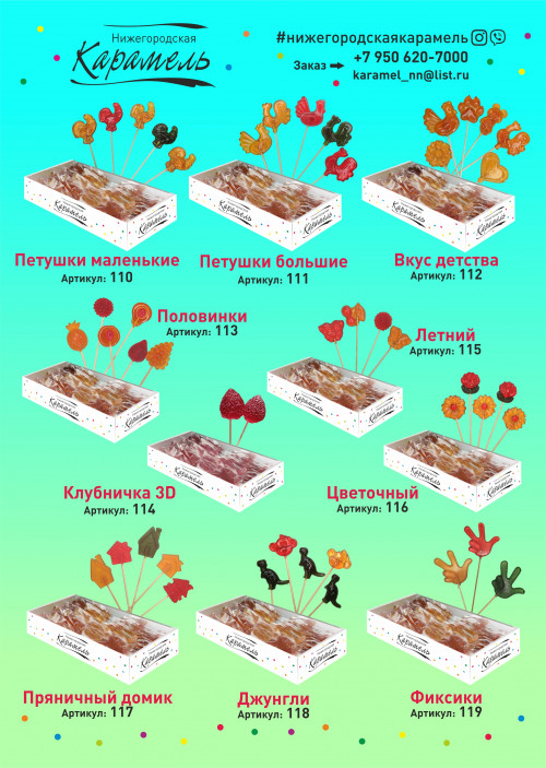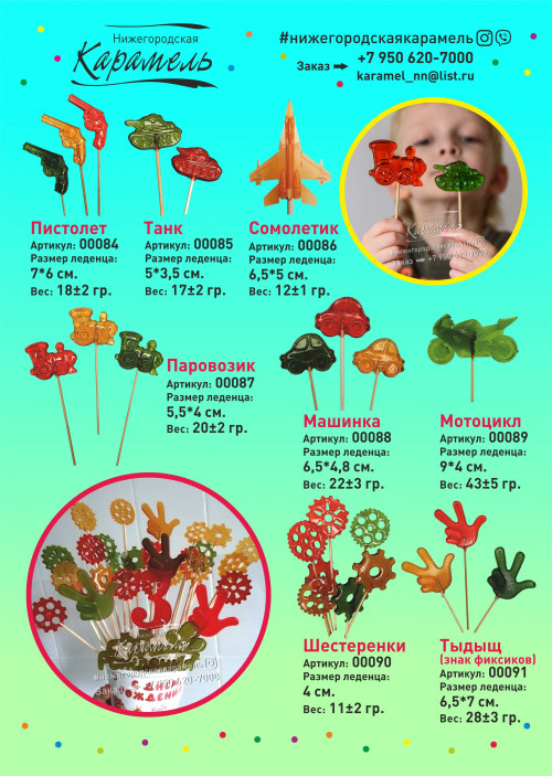 У нас огромный выбор леденцов, некоторые варианты указаны в каталоге со всеми параметрами(вес, размер).